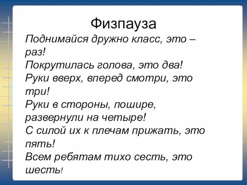 ФизпаузаПоднимайся дружно класс, это – раз! Покрутилась голова, это два! Руки вверх, вперед смотри, это три! Руки