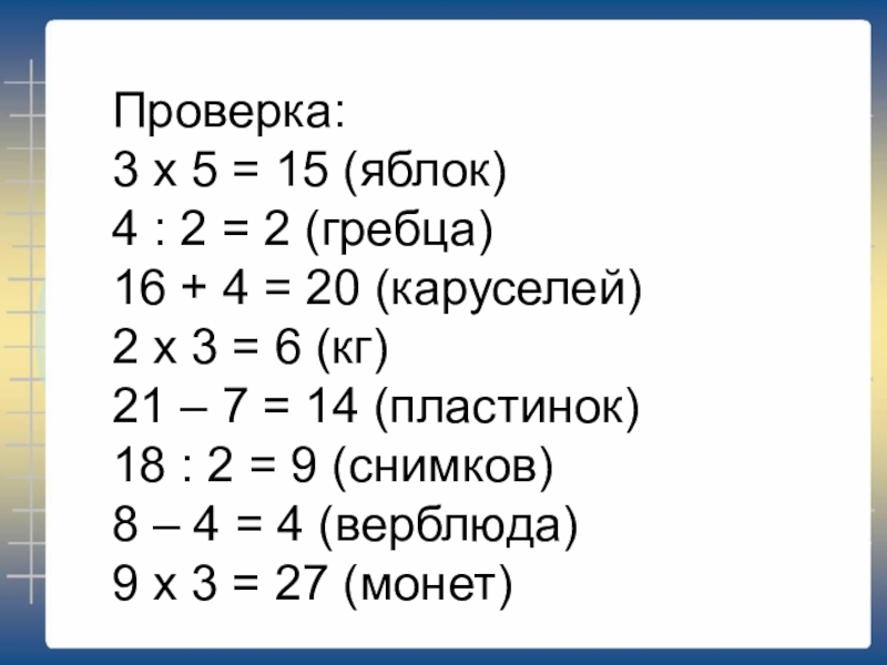 Проверка:3 х 5 = 15 (яблок)4 : 2 = 2 (гребца)16 + 4 = 20 (каруселей)2 х