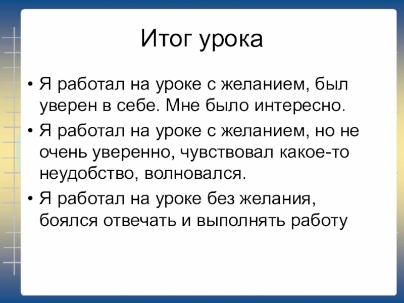 Итог урокаЯ работал на уроке с желанием, был уверен в себе. Мне было интересно.Я работал на уроке