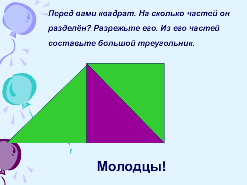 Перед вами квадрат. На сколько частей он разделён? Разрежьте его. Из его частей составьте большой треугольник.Молодцы!