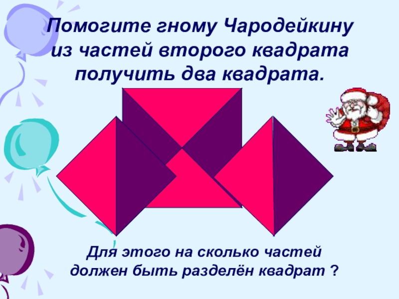 Слайд 3Помогите гному Чародейкину из частей второго квадрата получить два квадрата.