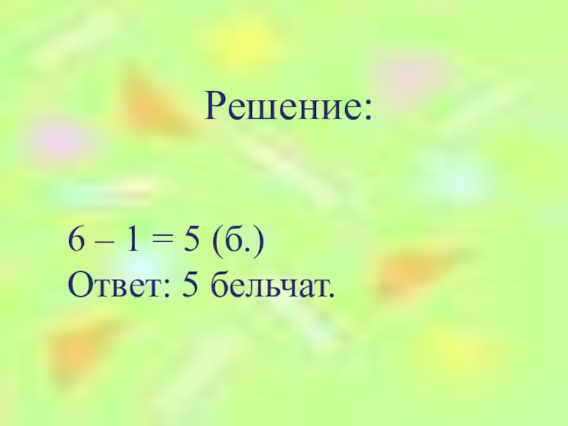 Решение:6 – 1 = 5 (б.)Ответ: 5 бельчат.