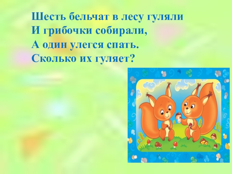 Шесть бельчат в лесу гулялиИ грибочки собирали,А один улегся спать.Сколько их гуляет?