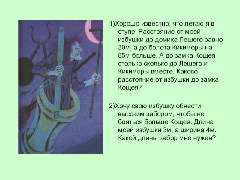 Слайд 101)Хорошо известно, что летаю я в ступе. Расстояние от моей избушки