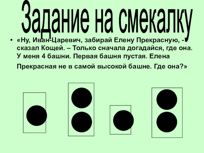 догадайся, где она. У меня 4 башни. Первая башня пустая. Елена Прекрасная не в самой высокой башне. Где она?»