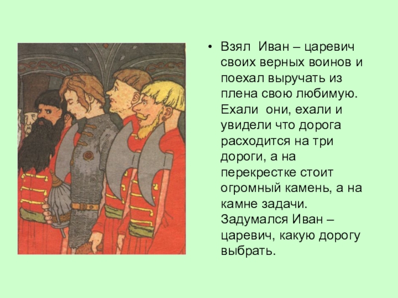 Слайд 5Взял Иван – царевич своих верных воинов и поехал выручать из
