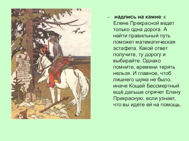 А найти правильный путь поможет математическая эстафета. Какой ответ получите, ту дорогу и выбирайте. Однако помните, времени терять нельзя. И главное, чтоб лишнего шума не было, иначе Кощей Бессмертный ещё дальше спрячет Елену Прекрасную, если узнает, что вы идете ей на помощь.