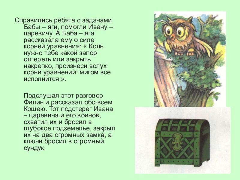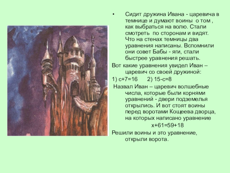 том , как выбраться на волю. Стали смотреть по сторонам и видят. Что на стенах темницы два уравнения написаны. Вспомнили они совет Бабы - яги, стали быстрее уравнения решать.
