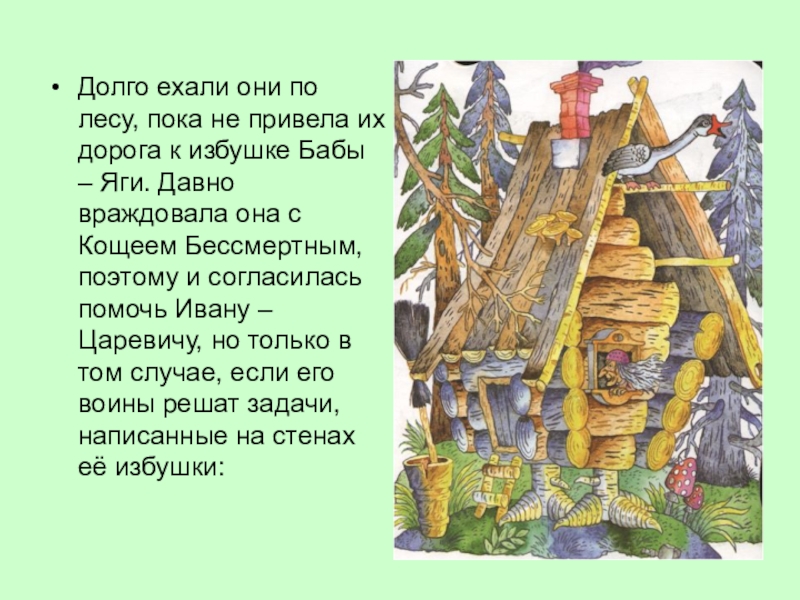 избушке Бабы – Яги. Давно враждовала она с Кощеем Бессмертным, поэтому и согласилась помочь Ивану – Царевичу, но только в том случае, если его воины решат задачи, написанные на стенах её избушки: