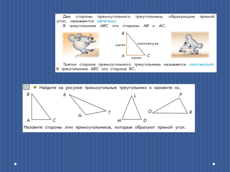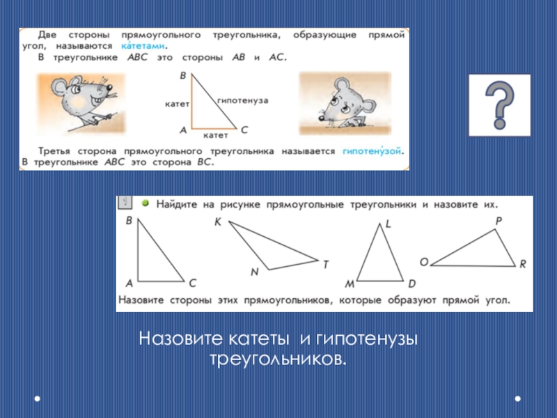Назовите катеты и гипотенузы треугольников.