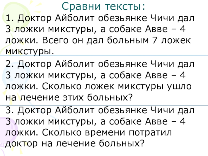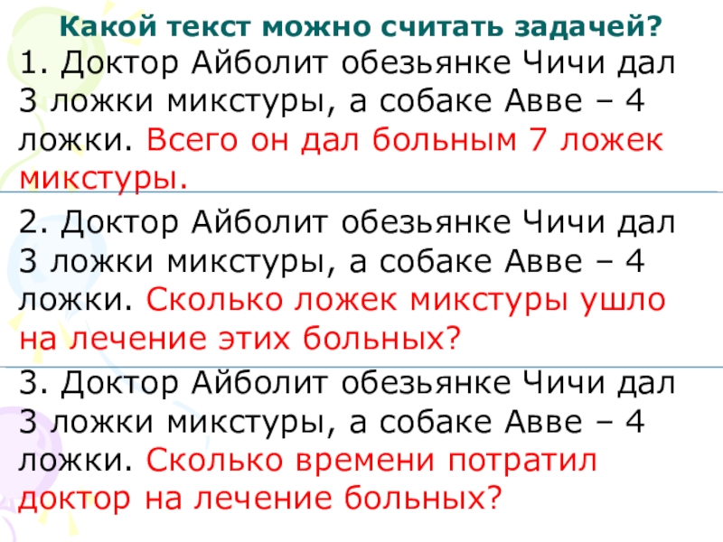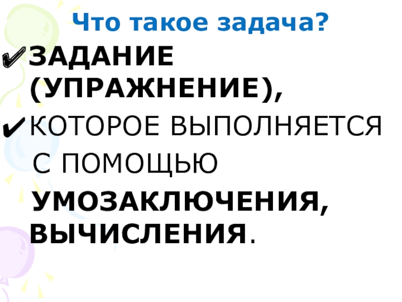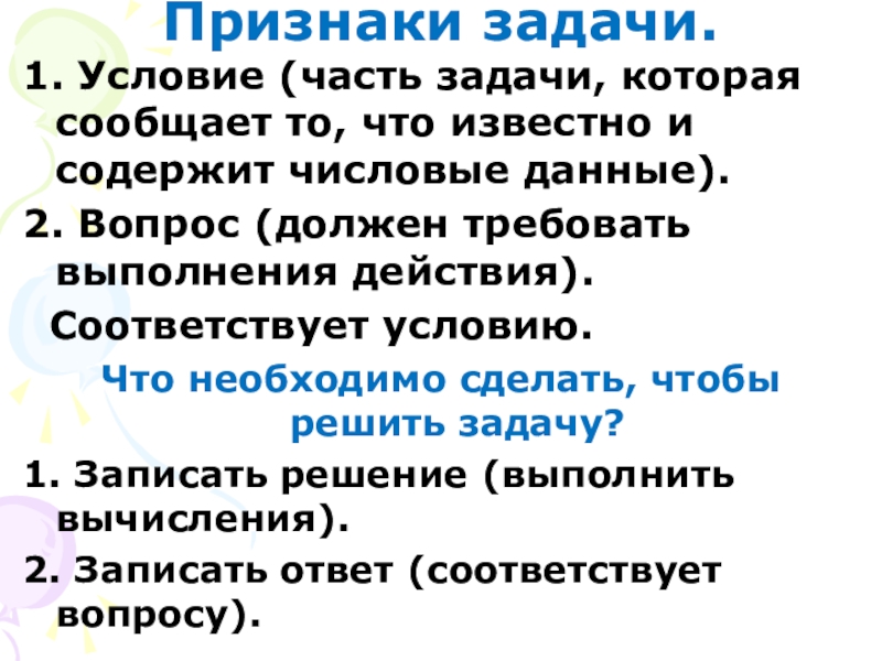 что такое задача. 2. Уметь различать задачи среди других текстов. 3. Знать признаки задачи. 4. Знать состав двузначных чисел. 5. Развивать операции мышления: сравнение.