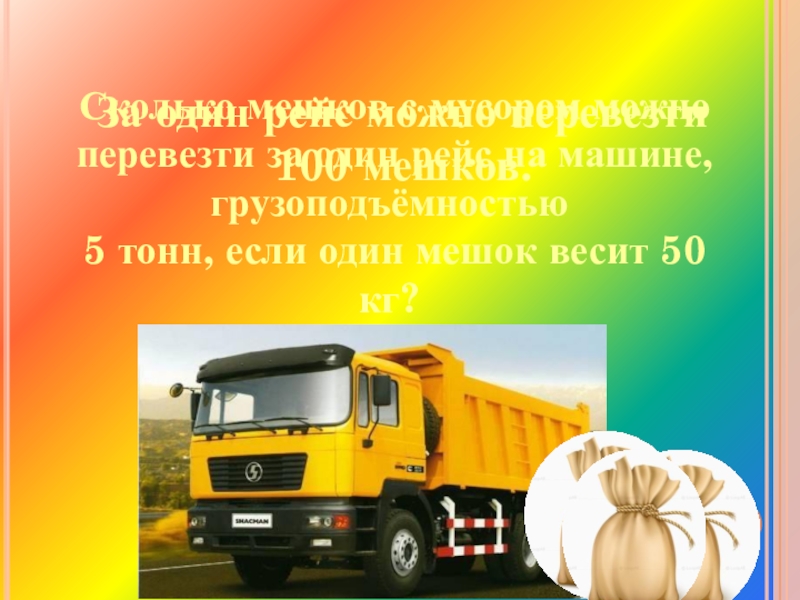 За один рейс можно перевезти 100 мешков.