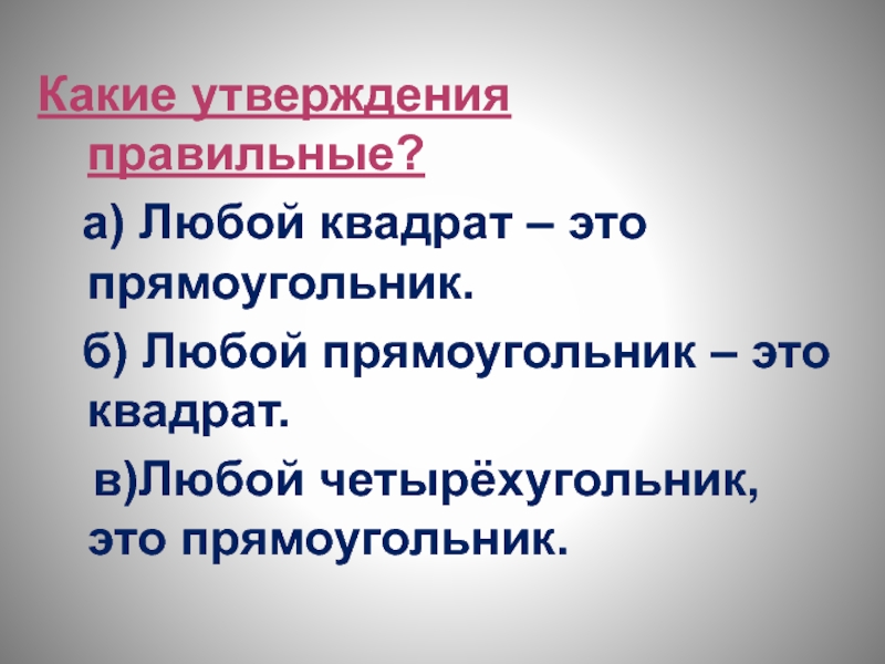 Какие утверждения правильные?	а) Любой квадрат – это прямоугольник.	б) Любой прямоугольник – это квадрат.  в)Любой четырёхугольник, это