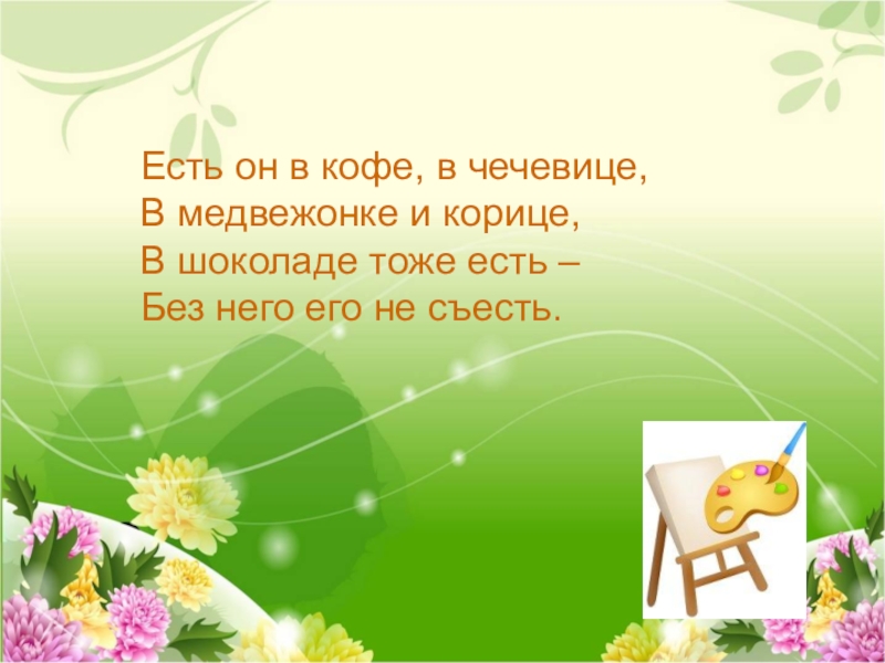 Слайд 16Есть он в кофе, в чечевице, В медвежонке и корице, В шоколаде тоже