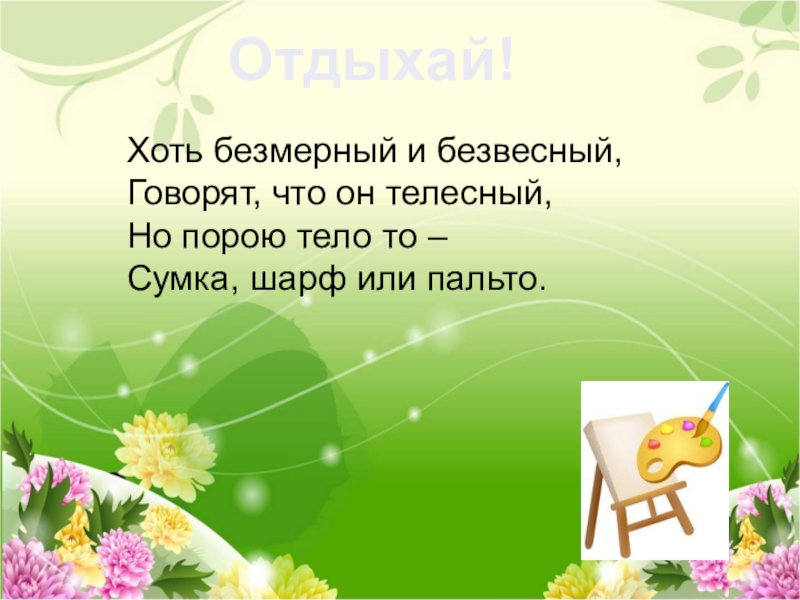 Отдыхай!Хоть безмерный и безвесный, Говорят, что он телесный, Но порою тело то – Сумка, шарф или пальто.