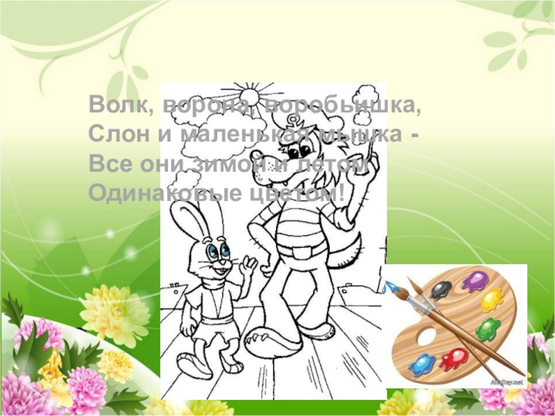 Волк, ворона, воробьишка, Слон и маленькая мышка - Все они зимой и летом Одинаковые цветом!