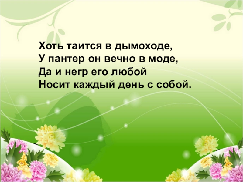 Слайд 10Хоть таится в дымоходе, У пантер он вечно в моде, Да и негр