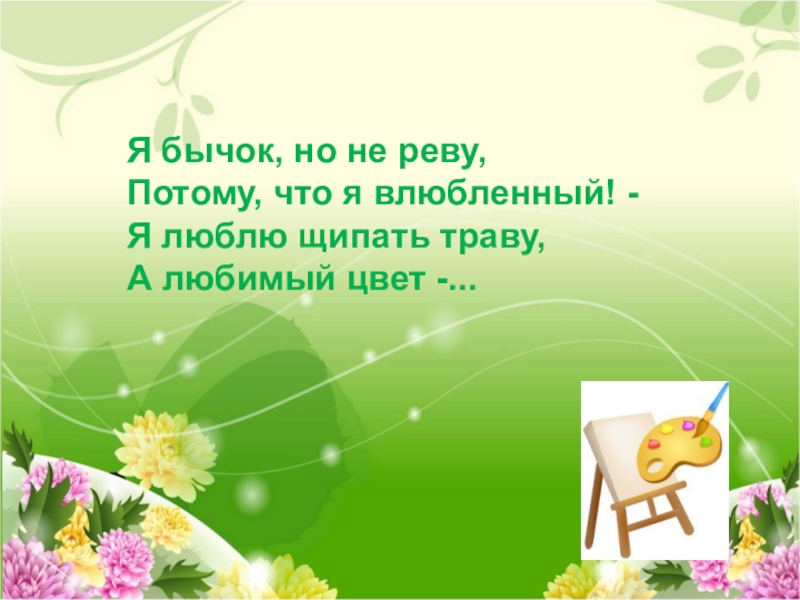 Я бычок, но не реву, Потому, что я влюбленный! - Я люблю щипать траву, А любимый цвет