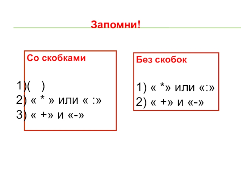 Запомни!Со скобками(  ) « * » или « :» « +» и «-»Без скобок1) « *»