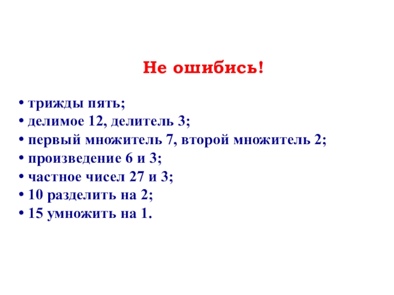 Не ошибись! трижды пять; делимое 12, делитель 3; первый множитель 7, второй множитель 2; произведение 6 и
