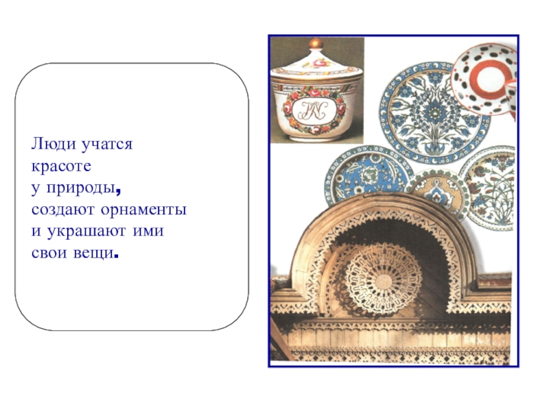 Люди учатся красоте у природы,создают орнаментыи украшают имисвои вещи.