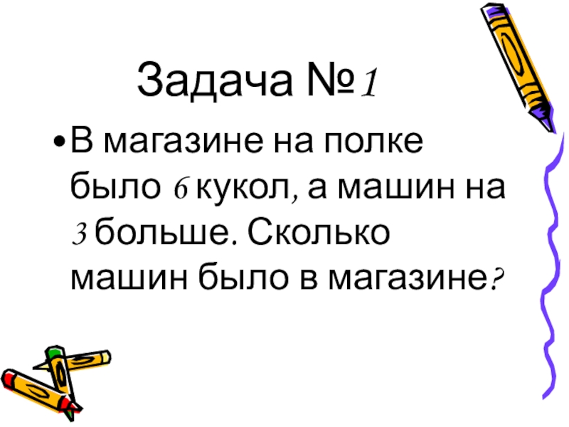 Задача №1В магазине на полке было 6 кукол, а машин на 3 больше. Сколько машин было в