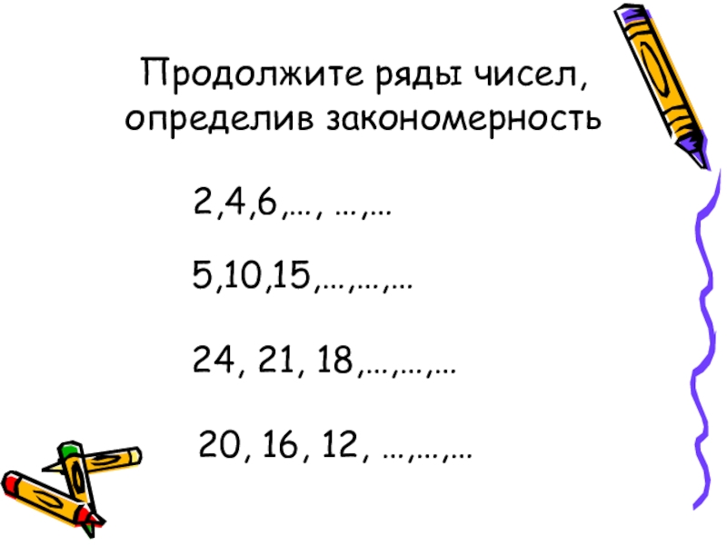 Продолжите ряды чисел, определив закономерность 2,4,6,…, …,… 5,10,15,…,…,… 24, 21, 18,…,…,…