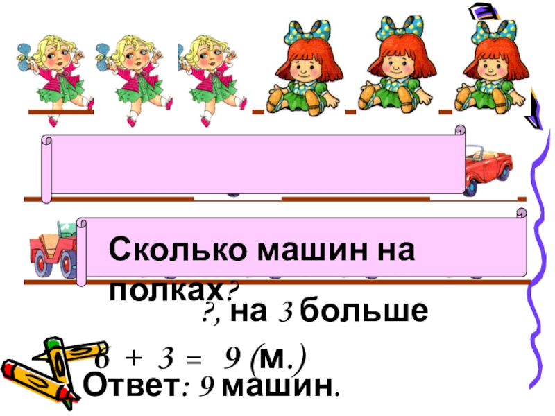 ?, на 3 больше6+3=9(м.)Сколько машин на полках?Ответ: 9 машин.