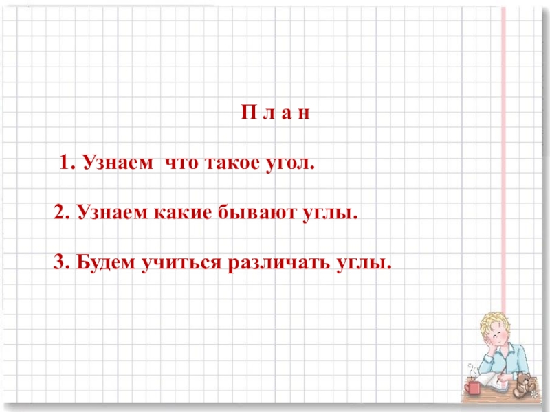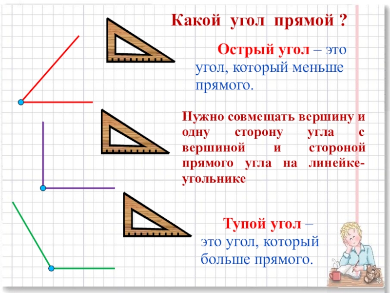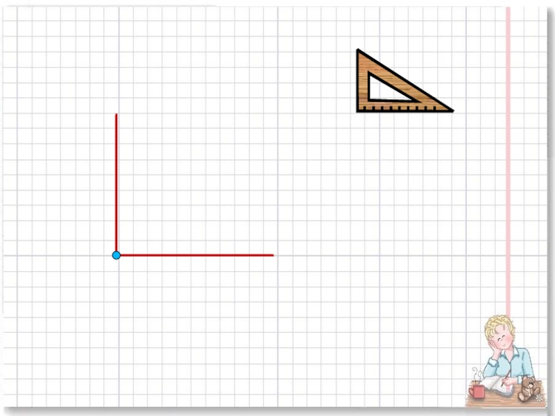 Нужно совмещать вершину и одну сторону угла с вершиной и стороной прямого угла на линейке-угольнике