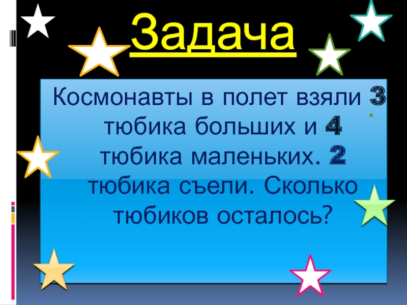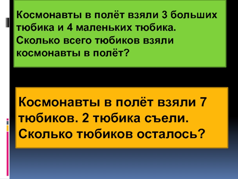 Космонавты в полёт взяли 7 тюбиков. 2 тюбика съели. Сколько тюбиков осталось?