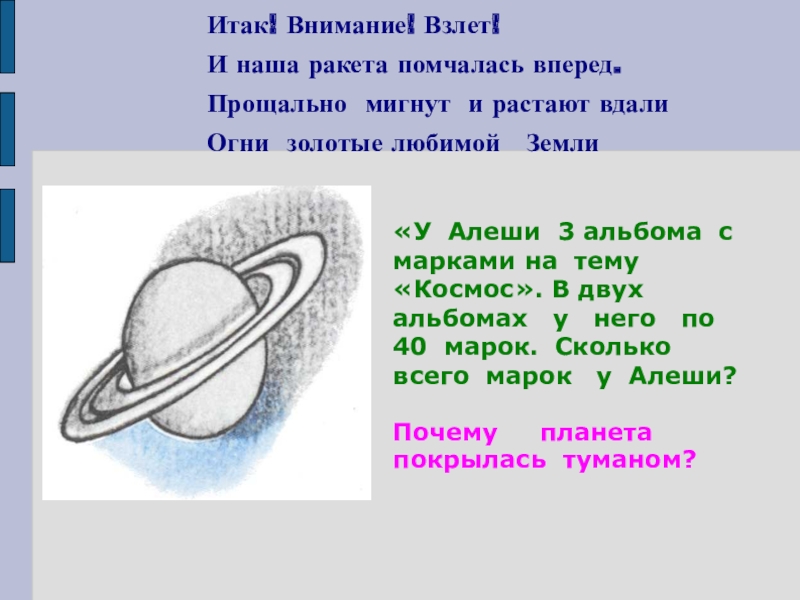 «У Алеши 3 альбома с марками на тему «Космос». В двух альбомах у него по 40 марок. Сколько всего марок у Алеши?