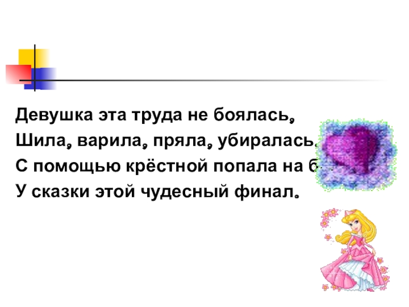 Девушка эта труда не боялась,Шила, варила, пряла, убиралась.С помощью крёстной попала на балУ сказки этой чудесный финал.