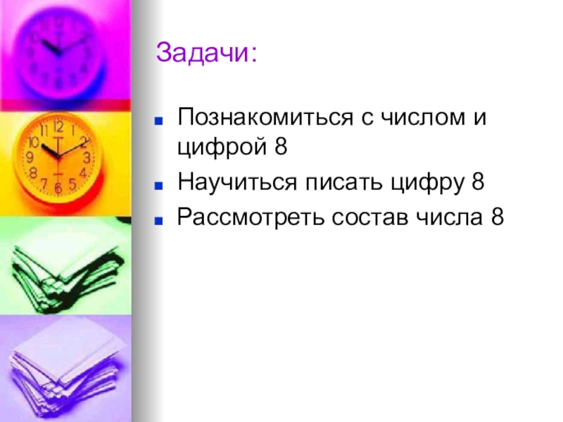 Задачи:Познакомиться с числом и цифрой 8Научиться писать цифру 8Рассмотреть состав числа 8