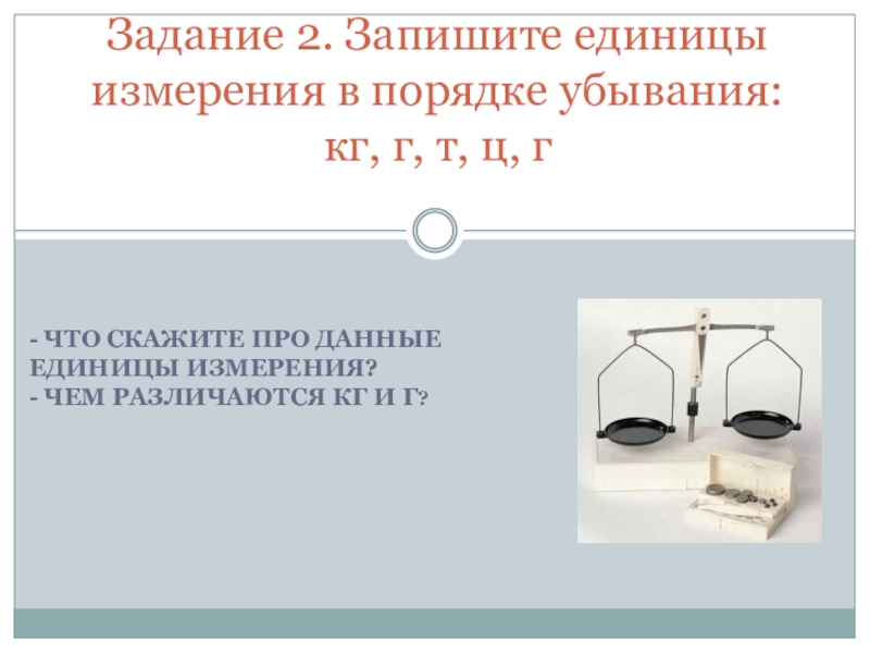 Задание 2. Запишите единицы измерения в порядке убывания: кг, г, т, ц, г