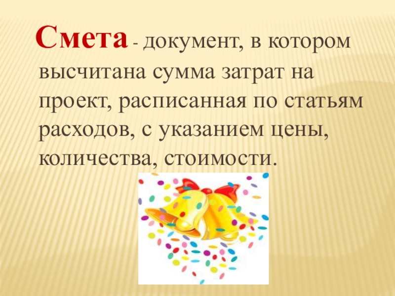 Слайд 14 Смета - документ, в котором высчитана сумма затрат на
