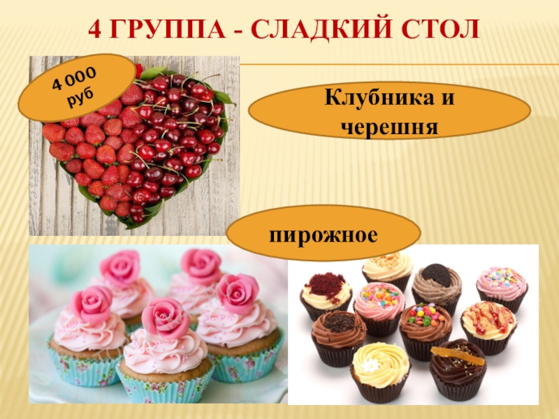 4 группа - Сладкий столКлубника и черешняпирожное4 000 руб