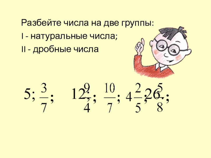 Разбейте числа на две группы:I - натуральные числа;II - дробные числа  	5;