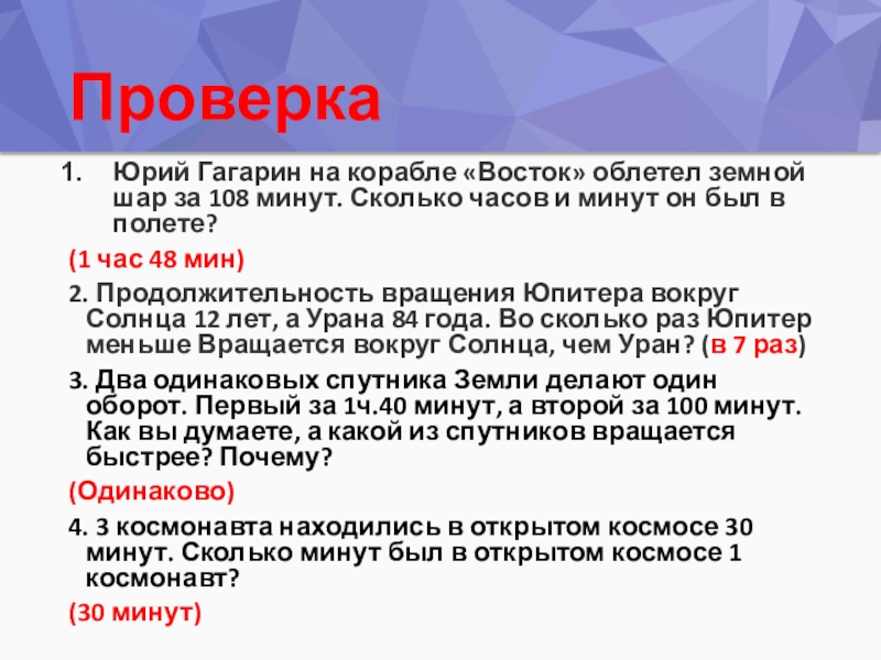ПроверкаЮрий Гагарин на корабле «Восток» облетел земной шар за 108 минут. Сколько часов и минут он был