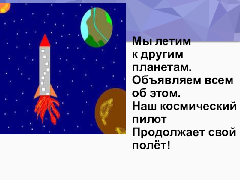 Мы летим  к другим планетам. Объявляем всем  об этом. Наш космический пилот Продолжает свой полёт!