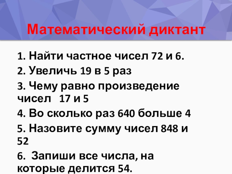 Математический диктант1. Найти частное чисел 72 и 6.2. Увеличь 19 в 5 раз3. Чему равно произведение чисел