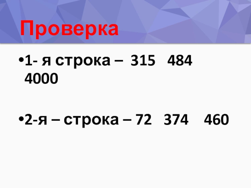 Проверка 1- я строка – 315  484  40002-я – строка – 72  374