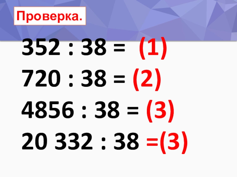 Проверка.352 : 38 = (1)720 : 38 = (2)4856 : 38 = (3)20 332 : 38 =(3)
