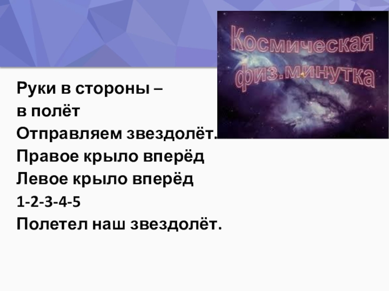 Руки в стороны – в полётОтправляем звездолёт.Правое крыло вперёдЛевое крыло вперёд1-2-3-4-5Полетел наш звездолёт.