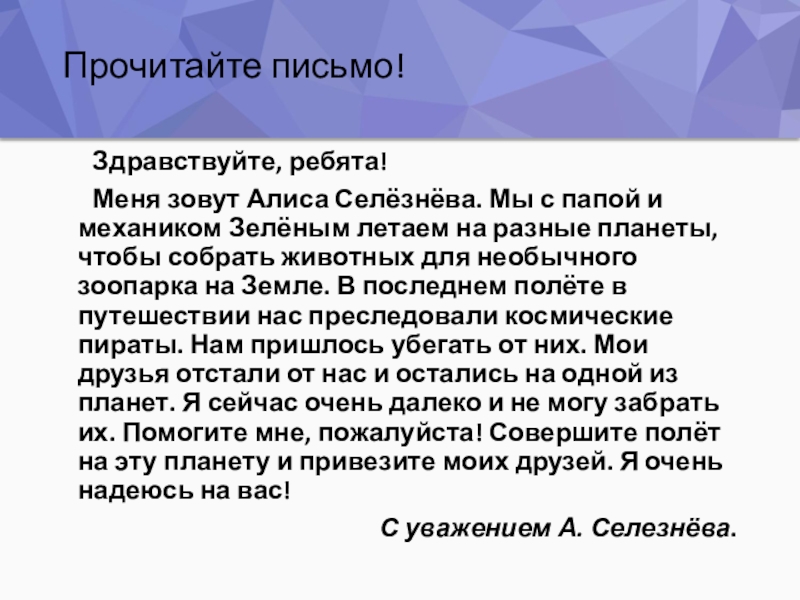 Прочитайте письмо!   Здравствуйте, ребята!   Меня зовут Алиса Селёзнёва. Мы с папой и механиком