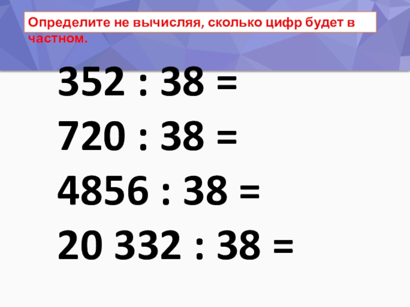 Определите не вычисляя, сколько цифр будет в частном.352 : 38 =720 : 38 =4856 : 38 =20