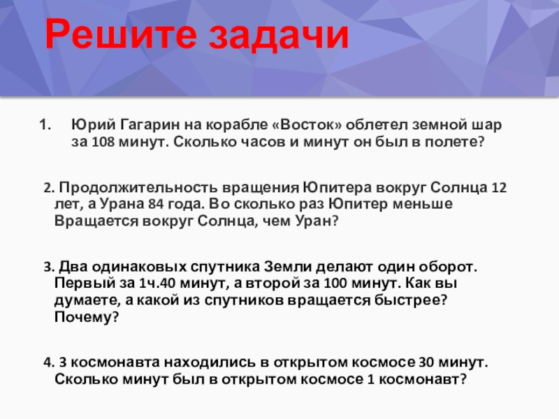 2. Продолжительность вращения Юпитера вокруг Солнца 12 лет, а Урана 84 года. Во сколько раз Юпитер меньше Вращается вокруг Солнца, чем Уран? (в 7 раз)