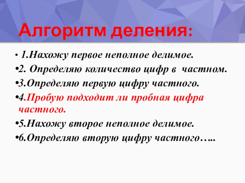 Алгоритм деления: 1.Нахожу первое неполное делимое.2. Определяю количество цифр в частном.3.Определяю первую цифру частного.4.Пробую подходит ли