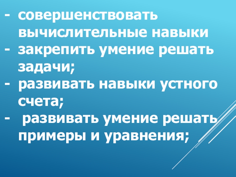 совершенствовать вычислительные навыки закрепить умение решать задачи;развивать навыки устного счета; развивать умение решать примеры и уравнения;