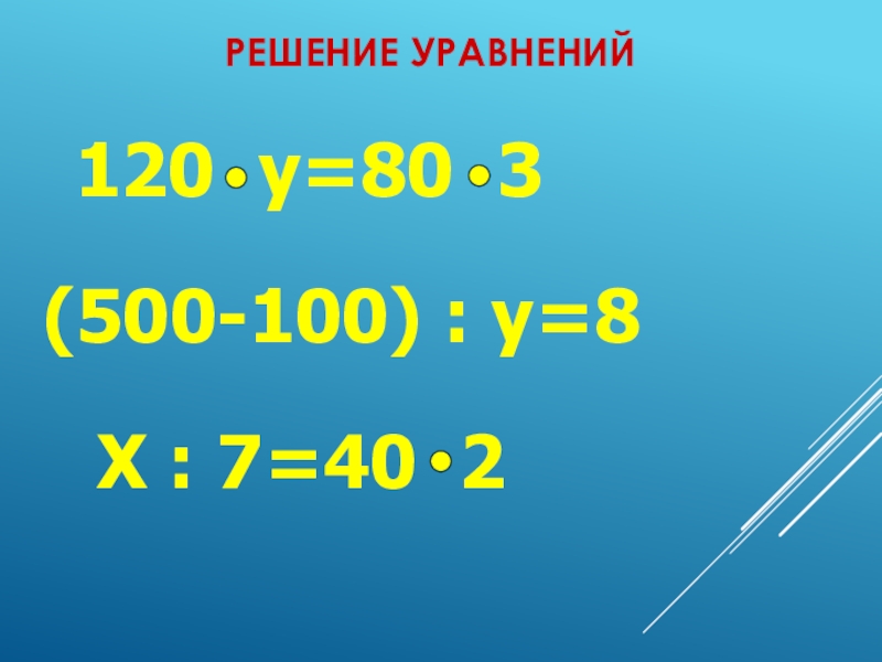 РЕШЕНИЕ УРАВНЕНИЙ 120 у=80 3(500-100) : у=8 Х : 7=40 2