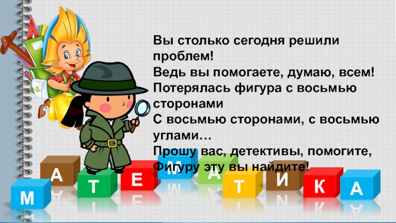 АТЕМАТИКАМВы столько сегодня решили проблем! Ведь вы помогаете, думаю, всем! Потерялась фигура с восьмью сторонами С восьмью